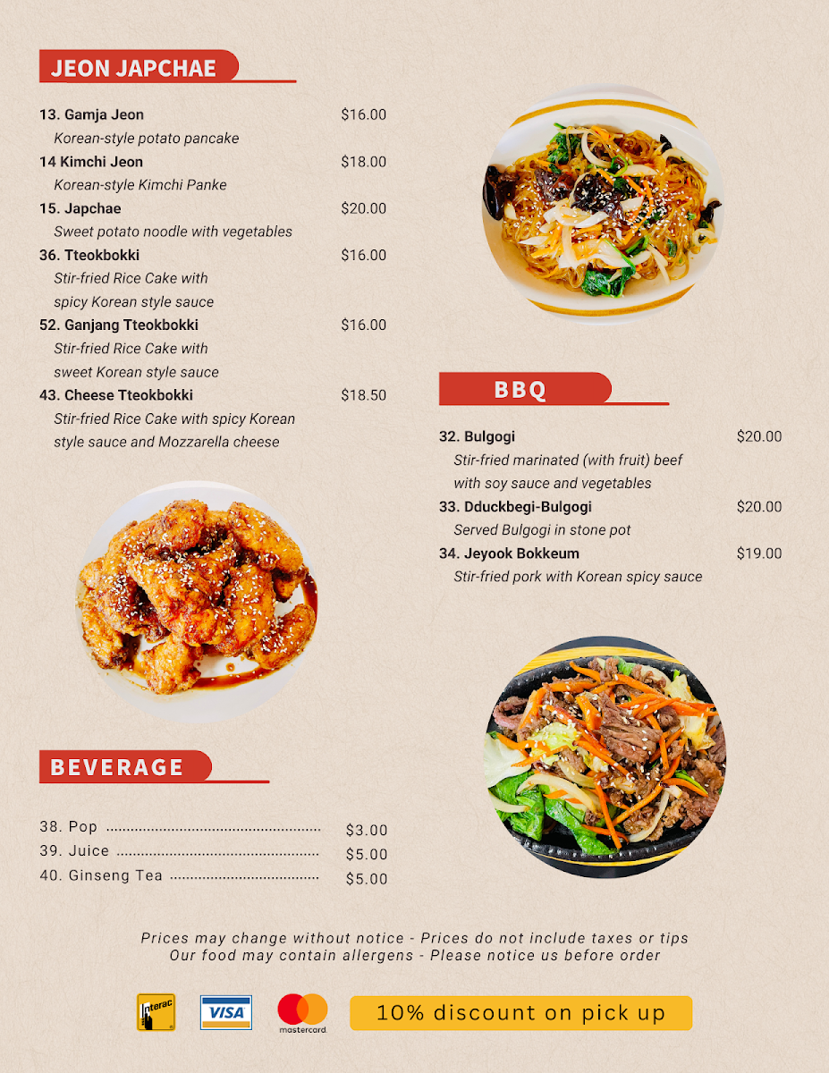 Delivery. I ordered the Soodubu Jjiagae (spicy Tofu beef soup with rice) and Bokkeum udon noodles (stir fried noodles with seafood). They were both very very delicious. Service wise, they followed my order instructions exactly. Packaging well.